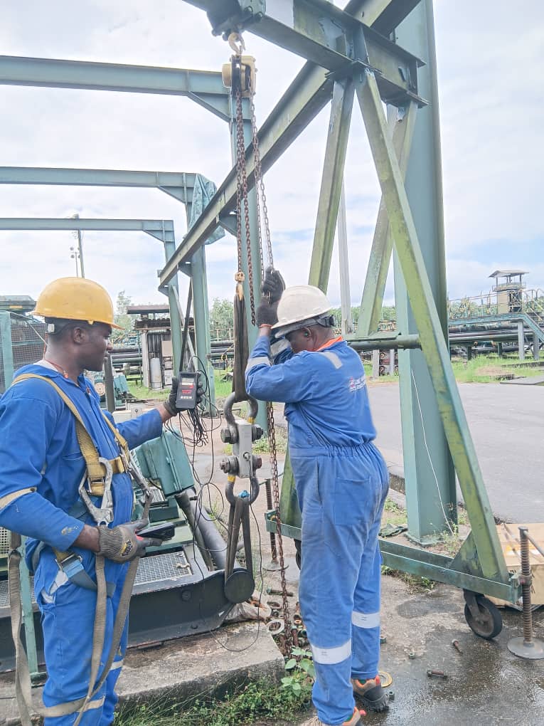 The Inspectors are ASNT II (AMERICAN SOCIETY FOR NON-DESTRUCTIVE TESTING) trained; qualified inspectors are LEEA, NSL, LOLER, PUWER, IADC, etc., certified and holds approved Certificates from the Federal Ministry of Labor and Productivity on certification and inspection of lifting equipment, boilers, pressure vessels, etc.To visually inspect, proof load test, and certify the load-bearing member like slings, shackles, cranes, hooks, links, pad-eyes, winches, fork Lifts, MAN LIFT, etc.